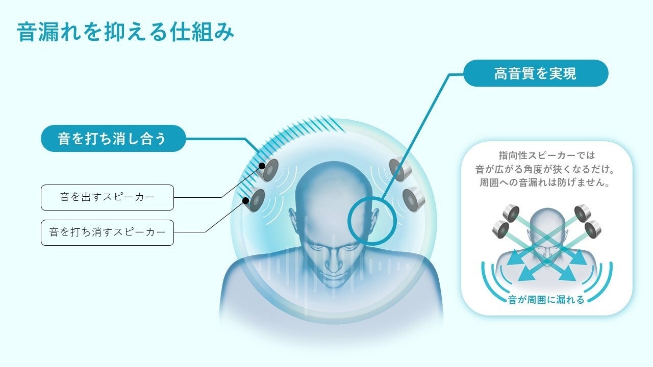 「音を出す」、「音を打ち消す」これら2つを同時に行うことにより全方位に対して音漏れを防ぐことができる、NTTソノリティ独自の技術です。