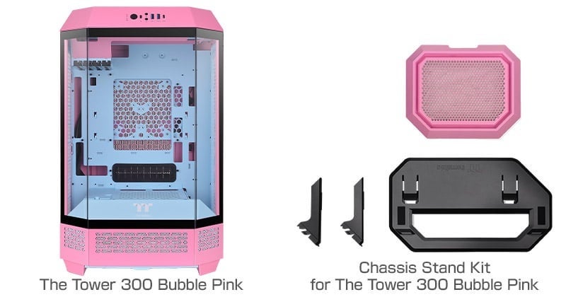 また、「The Tower 300」シリーズ対応アクセサリとして、付け替え用の底面パネルを付属する横置きスタンド「Chassis Stand Kit for The Tower 300 Bubble Pink」もラインナップしており、多彩なドレスアップを楽しめます。
