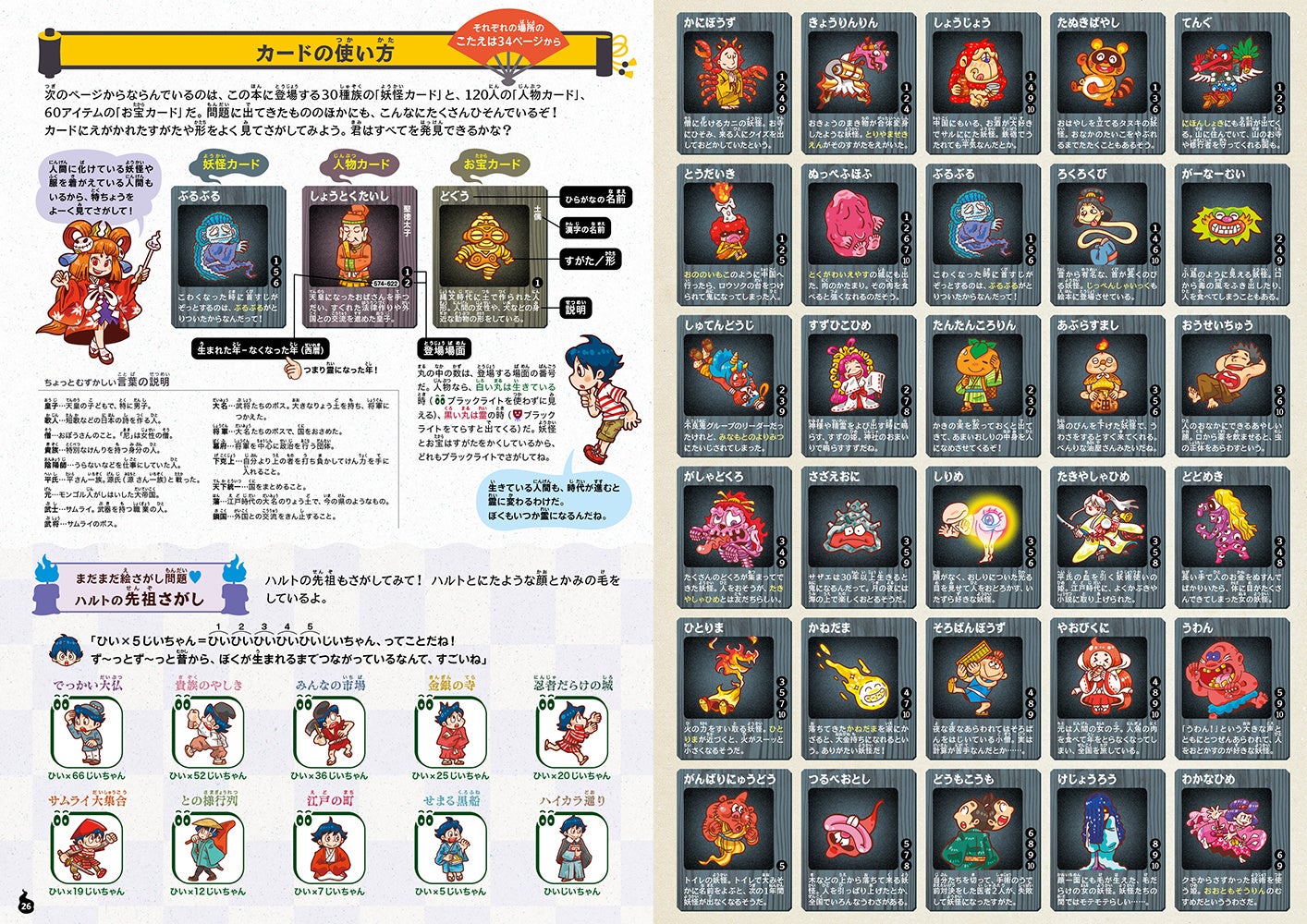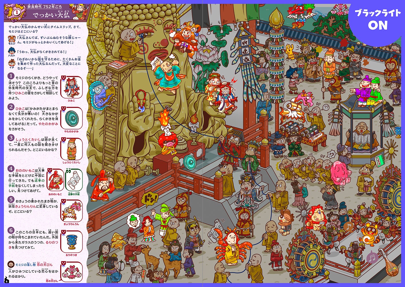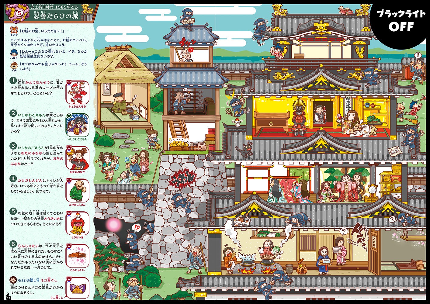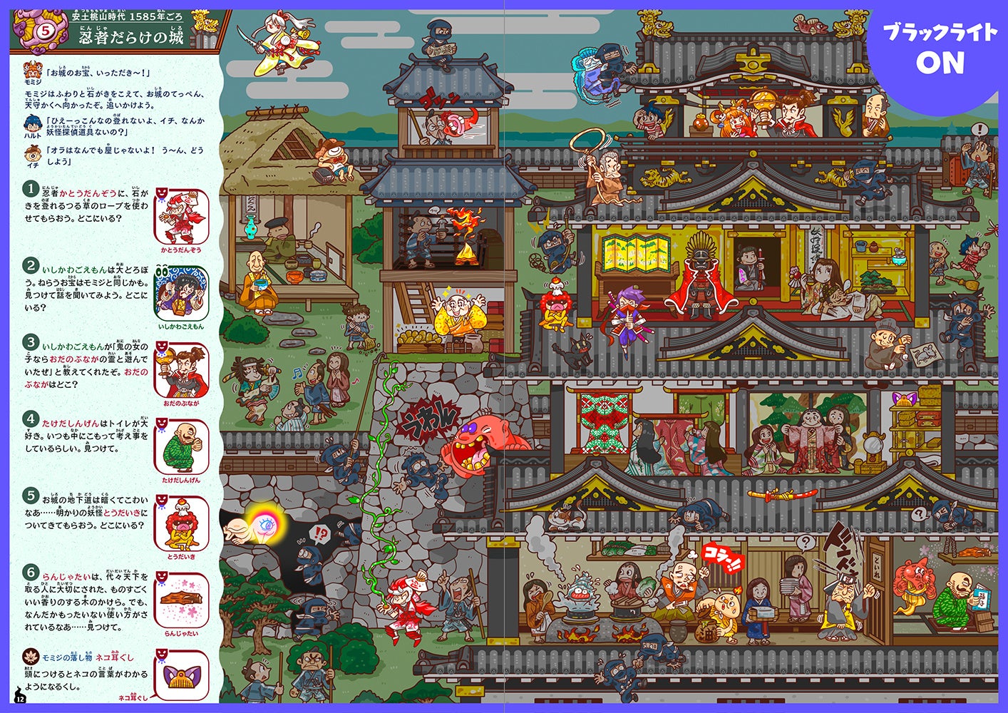 人間の男の子・ハルトと「妖怪探偵」のひとつめこぞう・イチは、いたずら好きの妖怪・モミジを追いかけて時空を超える旅に出かけることに。奈良時代~明治時代に渡る10の場面では、妖怪さらには卑弥呼や織田信長など歴史上の人物の霊が大騒ぎしていた!妖怪や霊の姿が見えるようになる「暗黒電灯(ブラックライト)」を使って、絵探しで騒動を解決しよう。