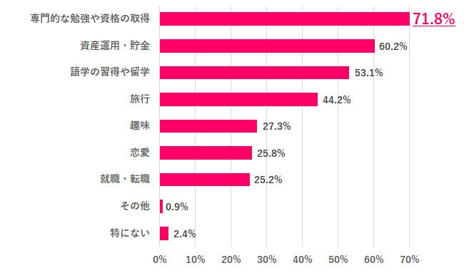 20歳に戻れるならしておきたいことを聞いたところ、「専門的な勉強や資格の取得」71.8%が最も多く、次いで「資産運用・貯金」60.2%、「語学の習得や留学」53.1%でした。将来への備えや選択肢を広げるための準備を、早めにやっておけばよかったと感じている人が多いことがわかりました。一方で、「特にない」と回答した人はわずか2.4%程でした。