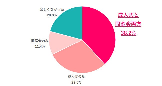 参加して楽しかったものを聞いたところ、「成人式と同窓会両方」が38.2%で最も多く、次いで「成人式のみ」29.5%、「同窓会のみ」11.4%でした。8割近くの人がいずれかの場を楽しめた一方で、「楽しくなかった」と回答した人は20.9%でした。