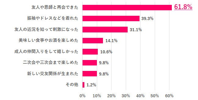 Q2で楽しかったと回答した人にその理由を聞いたところ、1位「友人や恩師と再会できた」61.8%、2位「振袖やドレスなどを着れた」39.3%、3位「友人の近況を知って刺激になった」31.1%でした。