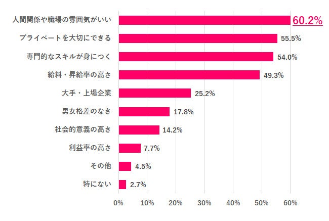 一方で「社会的意義の高さ」14.2%、「利益率の高さ」7.7%で、会社全体の事業や成長に関する点を重視する人は少ないことがわかりました。