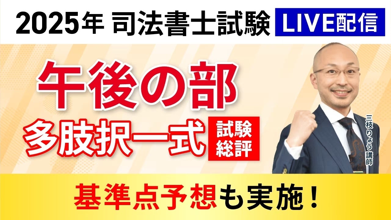 アガルートアカデミーは2025年 司法書士試験筆記試験の試験当日に実施した「解答速報」 「総評&基準点予想」YouTubeLIVE配信を会員登録不要で無料公開しております。
