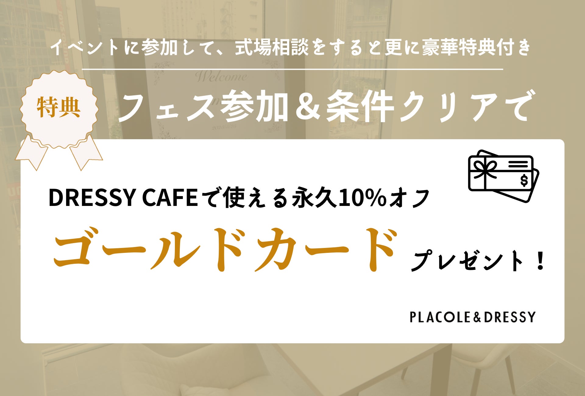 ウェディング初体験フェスにご参加いただき、条件クリアをされた新郎新婦にDRESSYCAFE名古屋・鎌倉で使用できる永久10%オフ「ゴールドカード」をプレゼント!結婚式準備、その後の結婚生活でもカフェでのひとときをよりお得に楽しめます。このゴールドカードは永続的にご利用いただけるため、特別な日の記念だけでなく、日常のひと息つく時間にも活用できます。