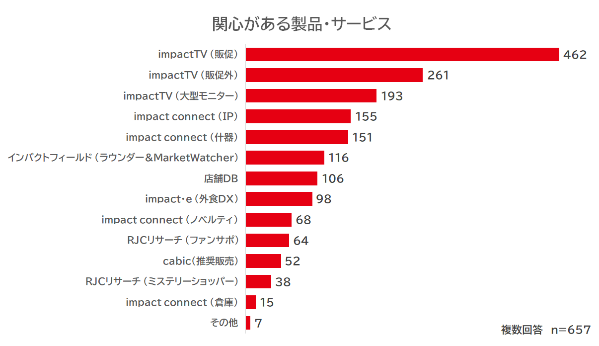 最も関心を集めた製品・サービスは、impactTVの 「デジタルサイネージ・業務用ICT及びIoT製品」 。次いで、今年展示ラインナップを拡大したimpact connectのアニメ・ゲーム・小説・映画などのコンテンツとそのキャラクターのIP (※1) コンテンツを活用したIPプロモーションに注目が集まりました。その他、impact connectの 「什器」 や、インパクトフィールドの 「ラウンダー & Market Watcher」 、「店舗DB」 などにも関心が集まりました。
