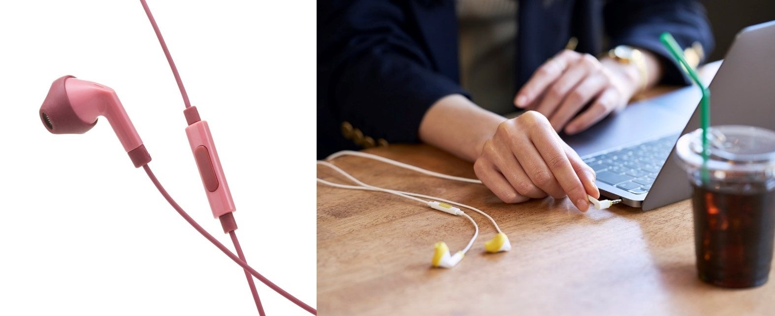インナーイヤータイプで音がこもりにくく、密閉しない装着感のヘッドホンです。有線タイプで、急なWeb会議でも接続のトラブルを心配することなく安心して使用できます。さらに、通話もできるマイク付きで、マイクには着信応答と通話終了スイッチを搭載しています。