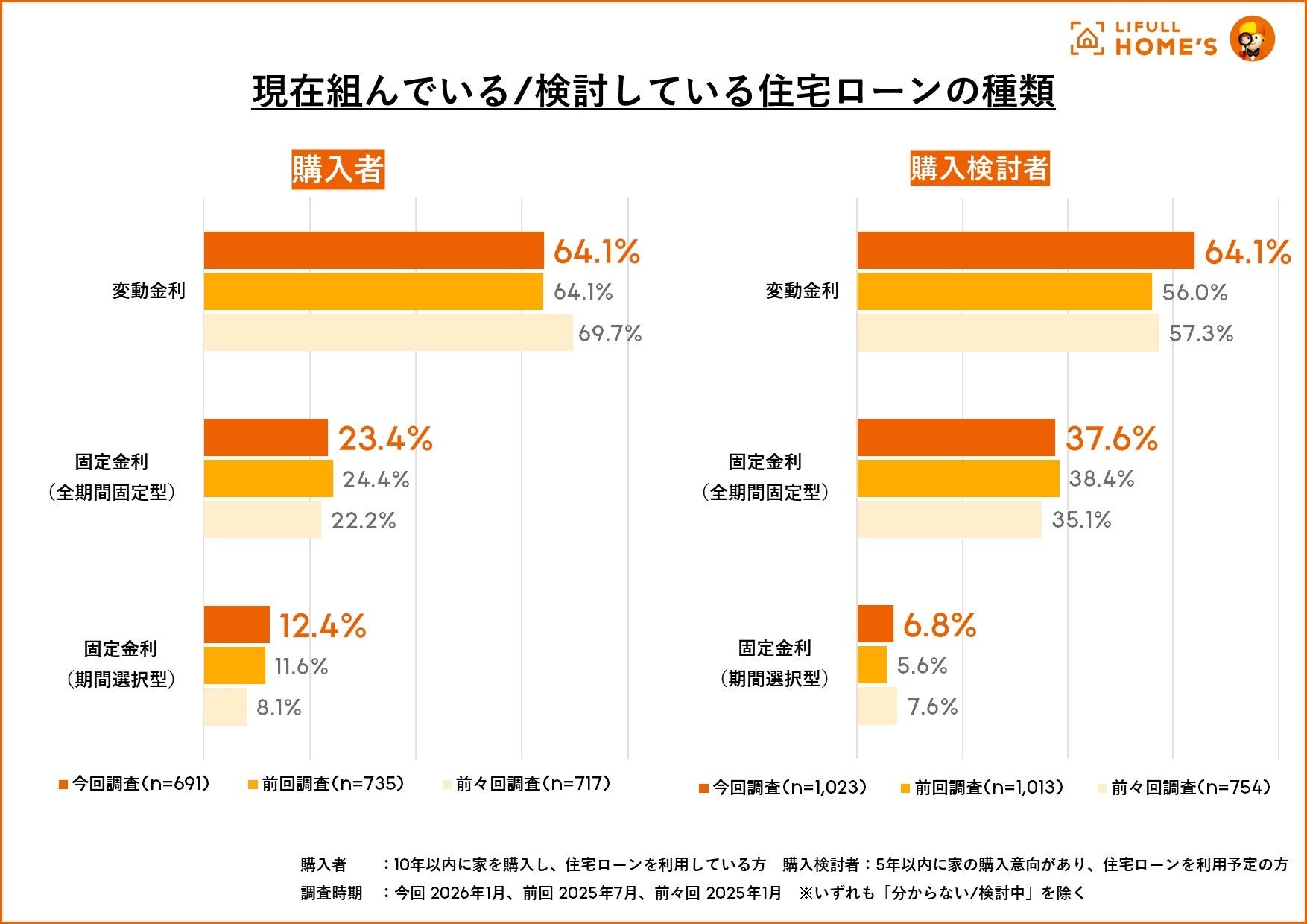 1月と7月に定期公表している「住宅ローン意識調査」の2026年1月版は、昨年12月に日銀が政策金利を0.75%に引き上げたものの、既に購入したユーザーも購入検討者も変動金利での借り入れがともに64.1%と過半を超え、購入者では横ばい、購入予定者では8.1ポイントの大幅上昇を記録しました。