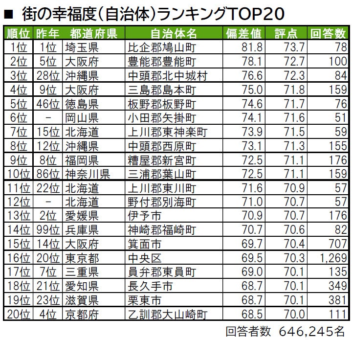 1位は2年連続で埼玉県比企郡鳩山町で、唯一偏差値80台の高い評価を得ています。2位は大阪府豊能郡豊能町(昨年5位)です。3位は沖縄県中頭郡北中城村(昨年28位)です。