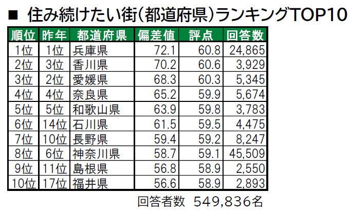 1位は2年連続で奈良県で、「住み続けたい街」「街に誇りがある」の両ランキングでは4位です。2位は2年連続で滋賀県です。3位は2年連続で兵庫県で、「住み続けたい街」1位、「街に誇りがある」「住みここち」2位、「街に愛着がある」3位と各ランキングで評価が高くなっています。トップ3は昨年と全く同じで、近畿地方の3県が上位に並ぶ結果となっています。