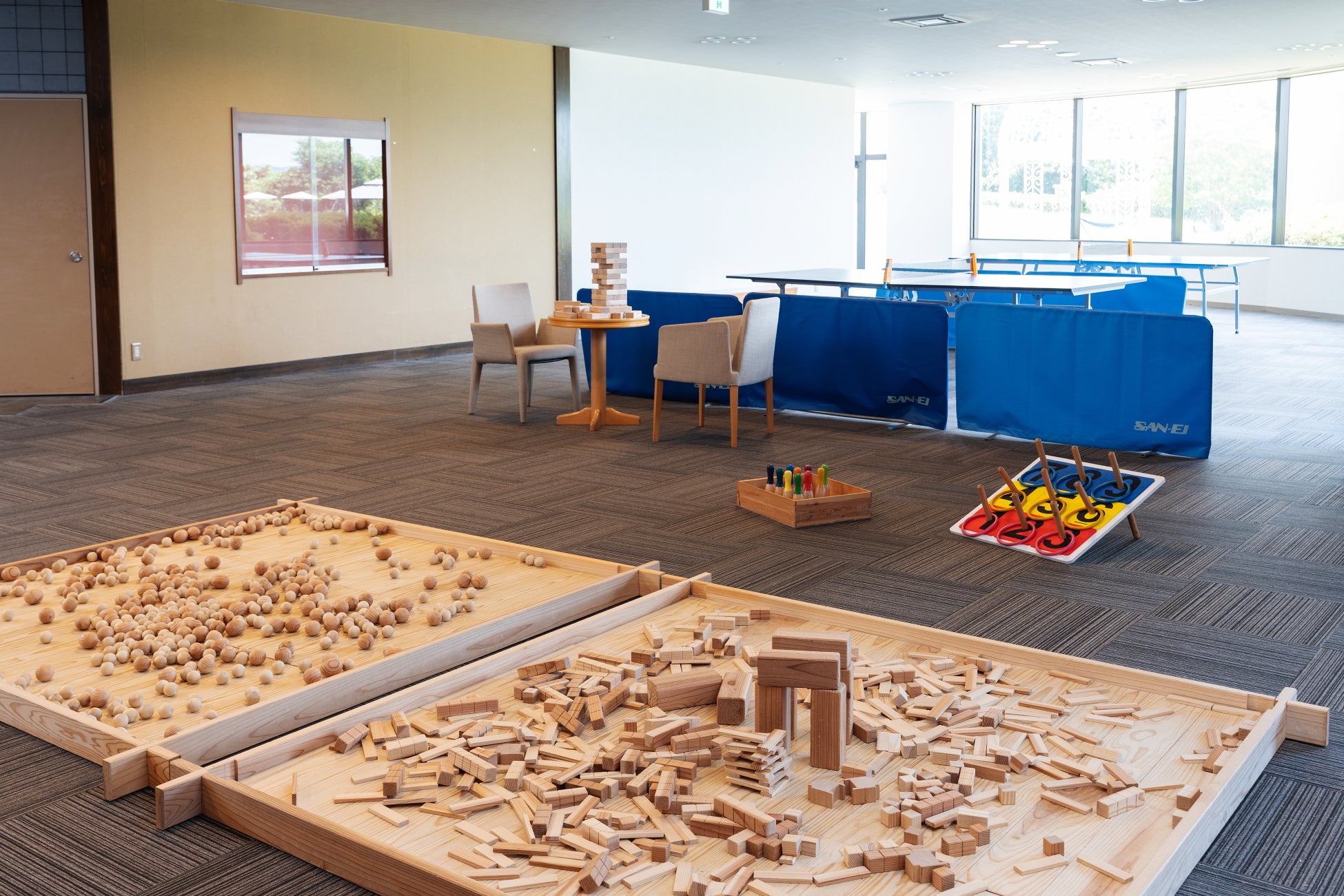 優しい肌ざわりの木の積み木を組み合わせて、自由な発想で作品を作れる「積み木コーナー」、大人もつい夢中になる「輪投げ」や「簡易ボーリング」、家族ではらはら・ドキドキ、白熱のひと時を楽しむバランスタワーなどが揃います。オンラインゲームやゲームアプリから離れ、デジタルデトックスしながら家族揃って満喫できる、おすすめのコーナーです。
