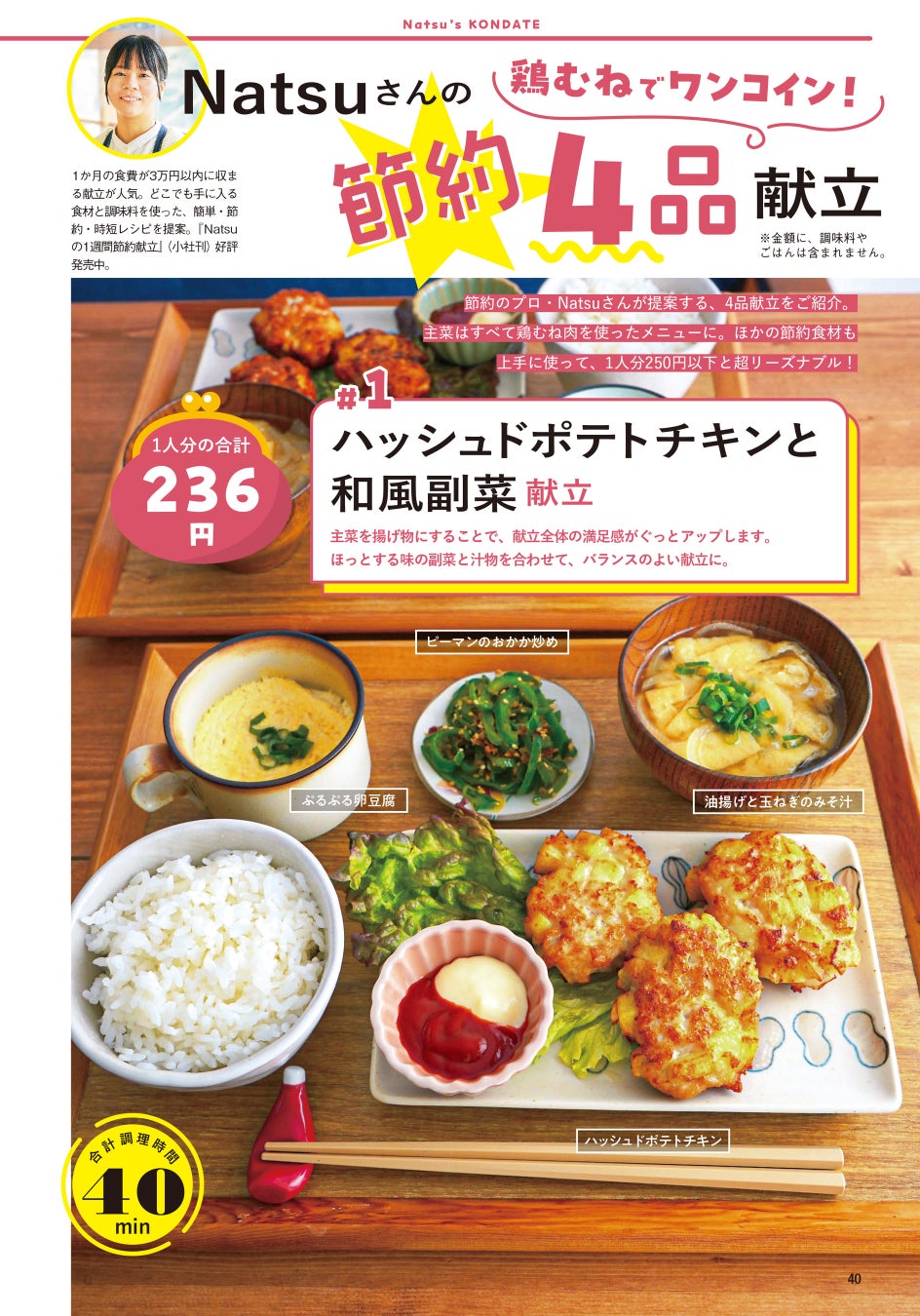また、みんなが大好きなハンバーグなどの“殿堂入り主菜“レシピに、Nadiaのレシピの中からぴったりの副菜と汁物を組み合わせて作ったNadia magazineオリジナルの最強献立も発表。厳選された組み合わせは野菜もたっぷりとれる、バランスのよい献立になっています。