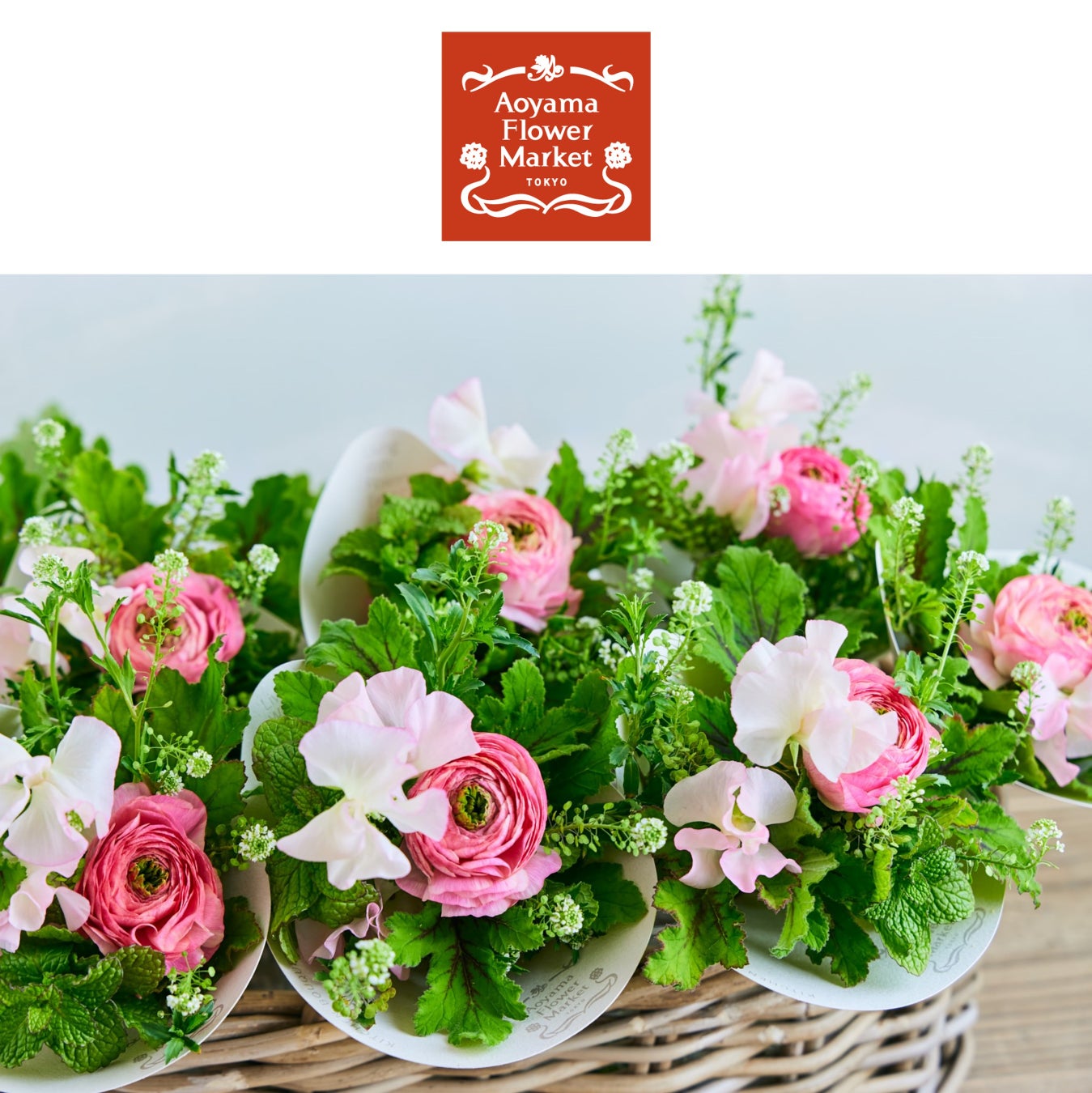 生活のシーンごとにご用意した青山フラワーマーケットの定番商品。季節の花を中心に束ねた、日々の暮らしに取り入れやすい小さなブーケです。グラスブーケ495円、キッチンブーケ660円、ダイニングブーケ935円の3種類を展開。