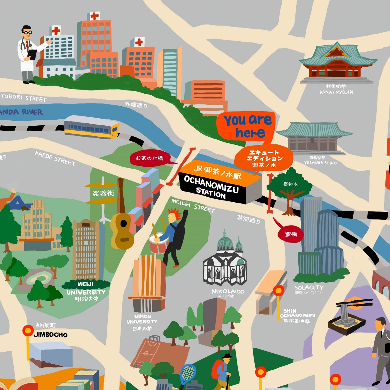 「エキュートエディション御茶ノ水」のコンセプト「こころ、くらし、ととのう」に沿って、 茗渓通りエントランスから2階へ進んだ場所に、御茶ノ水エリアの魅力を発信するコミュニティスペース「おちゃのば」を設けました。 ここでは、約8種類の御茶ノ水近隣で作られたフリーペーパーを設置するほか、 御茶ノ水エリアの見どころをまとめた「まちあるきマップ」を設置します。 このマップは、雑誌などで活躍するイラストレーターの竹内俊太郎さんが担当し、 周辺の歴史的建造物、楽器街、大学、そのほか見どころをオリジナルのイラストで紹介します。