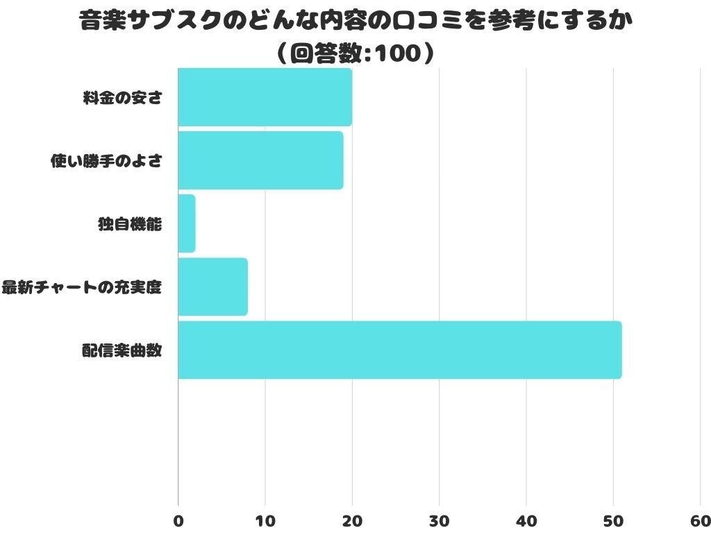 音楽サブスクのどんな内容の口コミを参考にするかをアンケートにて調査したところ、1位は「配信楽曲数」でした。