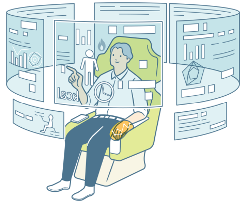 万博会場外では、お客様一人一人の日常の健康チェックデータに合わせて、駅ナカを活用した「駅(エキ)ササイズプログラム」や「ヘルシーレストラン」をリコメンドするなど、日常生活の延長で、負荷なく健康管理ができるとともに、駅に訪れたくなるような新しい価値をご提供することを検討中。