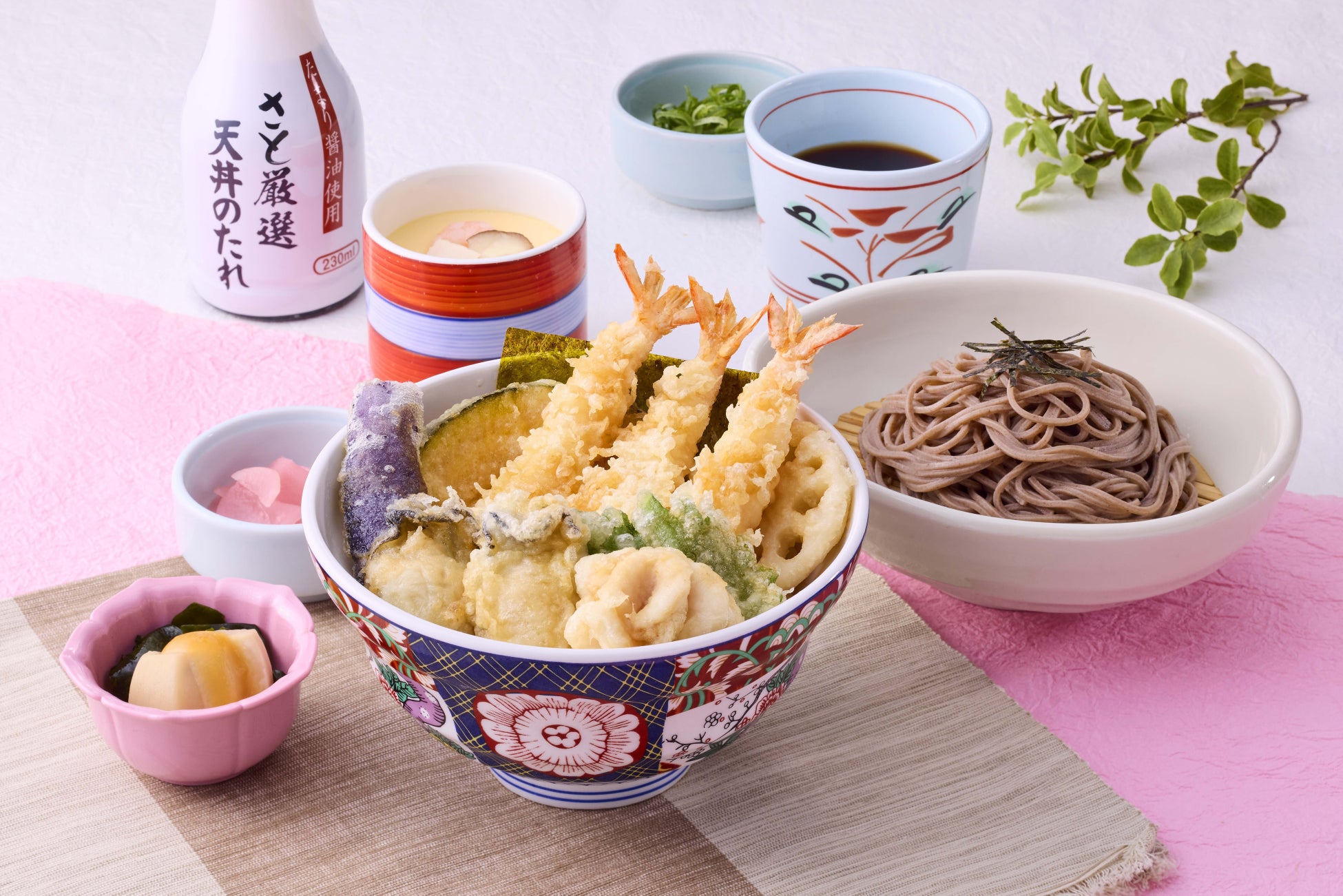 広島県産の牡蠣、たら白子の天ぷらに、海老天を3尾盛り付けた豪華な天丼です。 ゆず味噌をかけた里芋の小鉢と茶碗蒸し、そば/うどんがセットです。