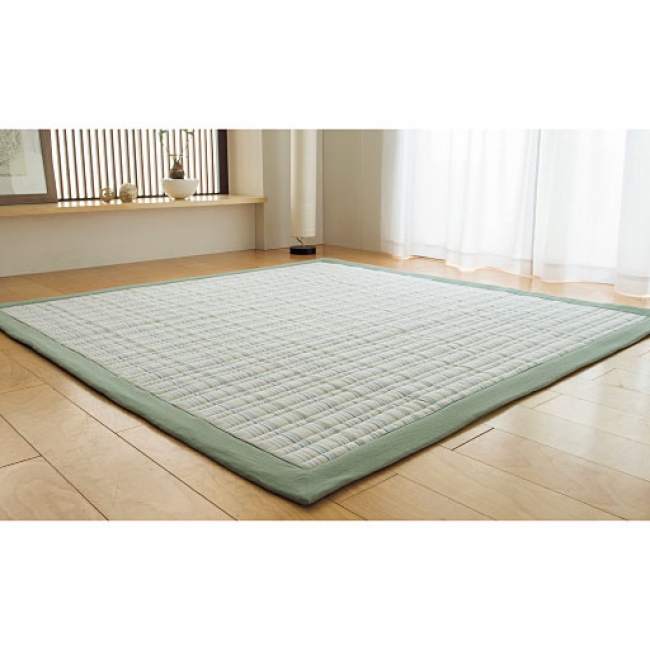 畳に使われる良質のい草を使った、素足にひんやり心地よい感触。フローリングの床にマッチする複数の色をミックスした無地調のモダンカラーが特徴です。い草は、伝統的に吸湿機能に優れているともいわれ、本商品は青森ヒバから抽出した成分による抗菌防臭加工に加え、汗消臭機能もプラスして快適性を高めたアイテムです。
