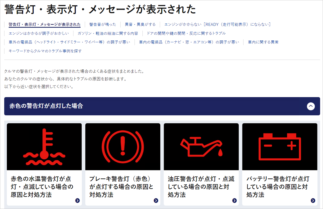 クルマのトラブルはさまざまな症状が考えられるため的確に言語化することは難しく、イメージで調べると誤った解決方法にたどり着きかねません。当コンテンツでは状況ごとに選択していき、マイカーの症状にたどりつきやすくしています。また、警告灯などの言葉で表現しにくいトラブルの症状などは、イラストを表示し直感で選択できるようにしました。