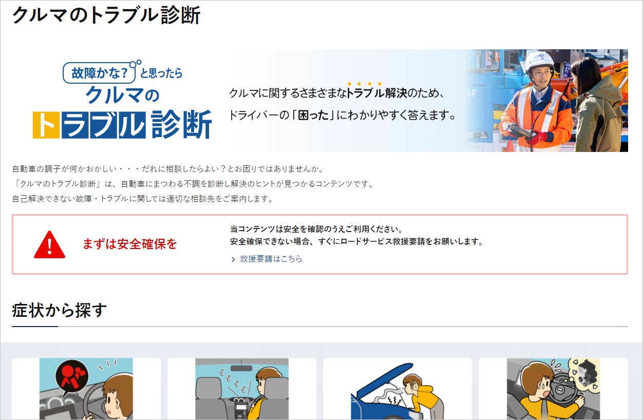 「これって故障かな?」「ロードサービスを呼んだ方が良い?」など、自身ではプロの手を借りるべきか判断できないクルマの不調を診断し解決のヒントが見つかります。