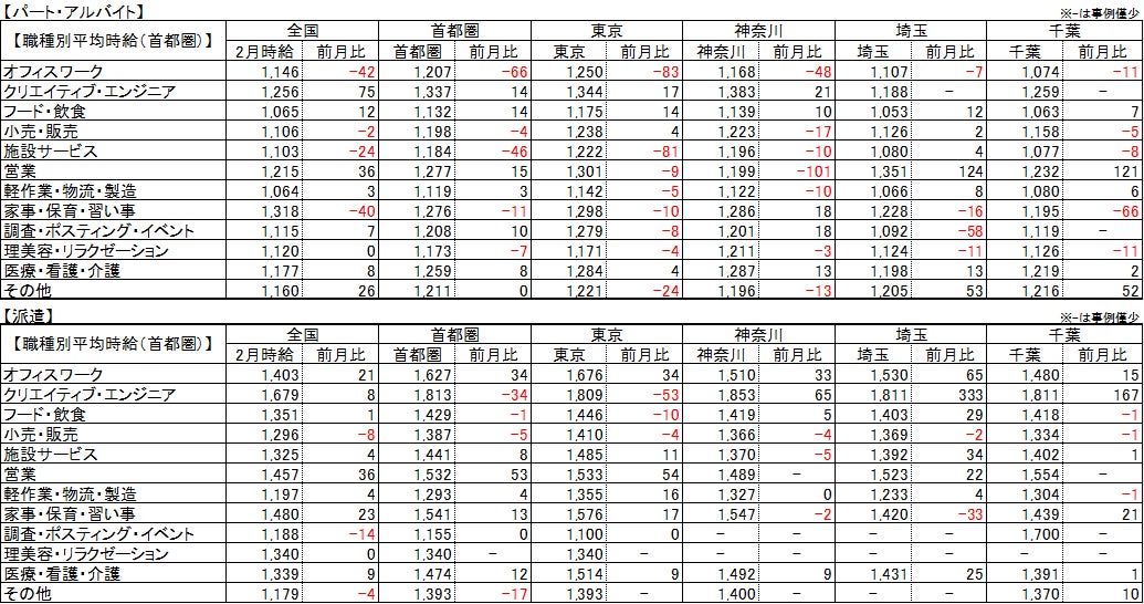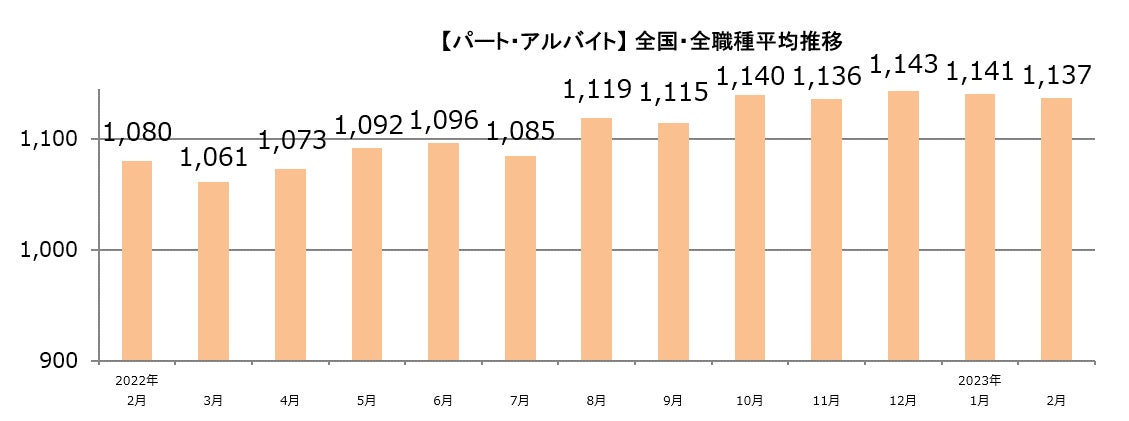 | 【パート・アルバイト】全国・全職種平均時給は1,137円。前月比-4円。前年同月比+57円。 【派遣】全国・全職種平均時給は1,311円。前月比+9円。前年同月比+5円。 【傾向】パート・アルバイトの平均時給は、全国・全職種平均よりも時給の高い「英会話講師」の求人が減少したことで2月の平均時給はやや下降したものの、その影響を除けば2022年3月以降、緩やかな上昇傾向。派遣の平均時給は、1月以降、全国・全職種平均より時給の低い「軽作業・物流・製造」カテゴリの個別案件が大幅に増加したことで全体の平均時給を押し下げているが、その影響を除けば2022年7月以降緩やかな上昇が続いている。 |