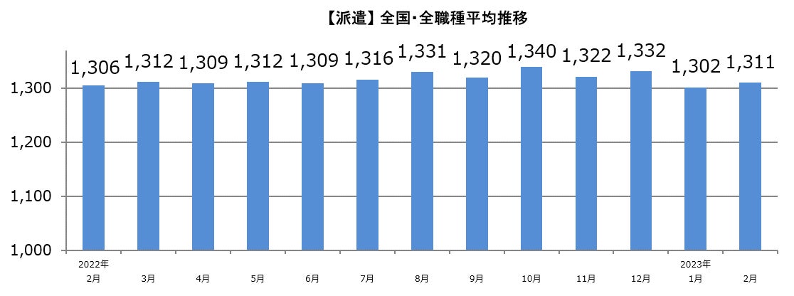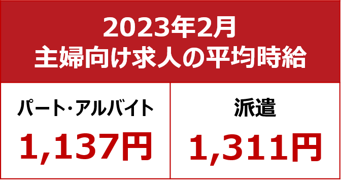 【2023年2月 主婦求人の平均時給】パート・アルバイト:『1,137円』、派遣:『1,311円』