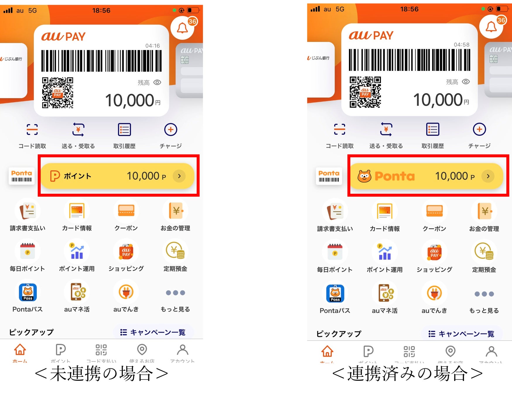 ・au IDとPonta会員IDが未連携の場合はポイント表示部分に「P」のアイコンが、連携済みの場合は「Pontaロゴ」が表示されます。