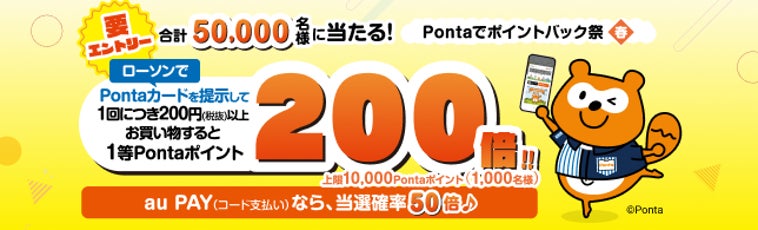 ローソンでPontaカードを提示して1回200円以上(税抜)お買い物すると、抽選で合計50,000名さまに最大200倍(通常1~2ポイント/200円(税抜))(注)のPontaポイントが当たります。さらに、au PAY(コード支払い)を利用した場合は当選確率が50倍にアップするほか、Pontaカードの提示も不要でより便利にご利用いただけます。