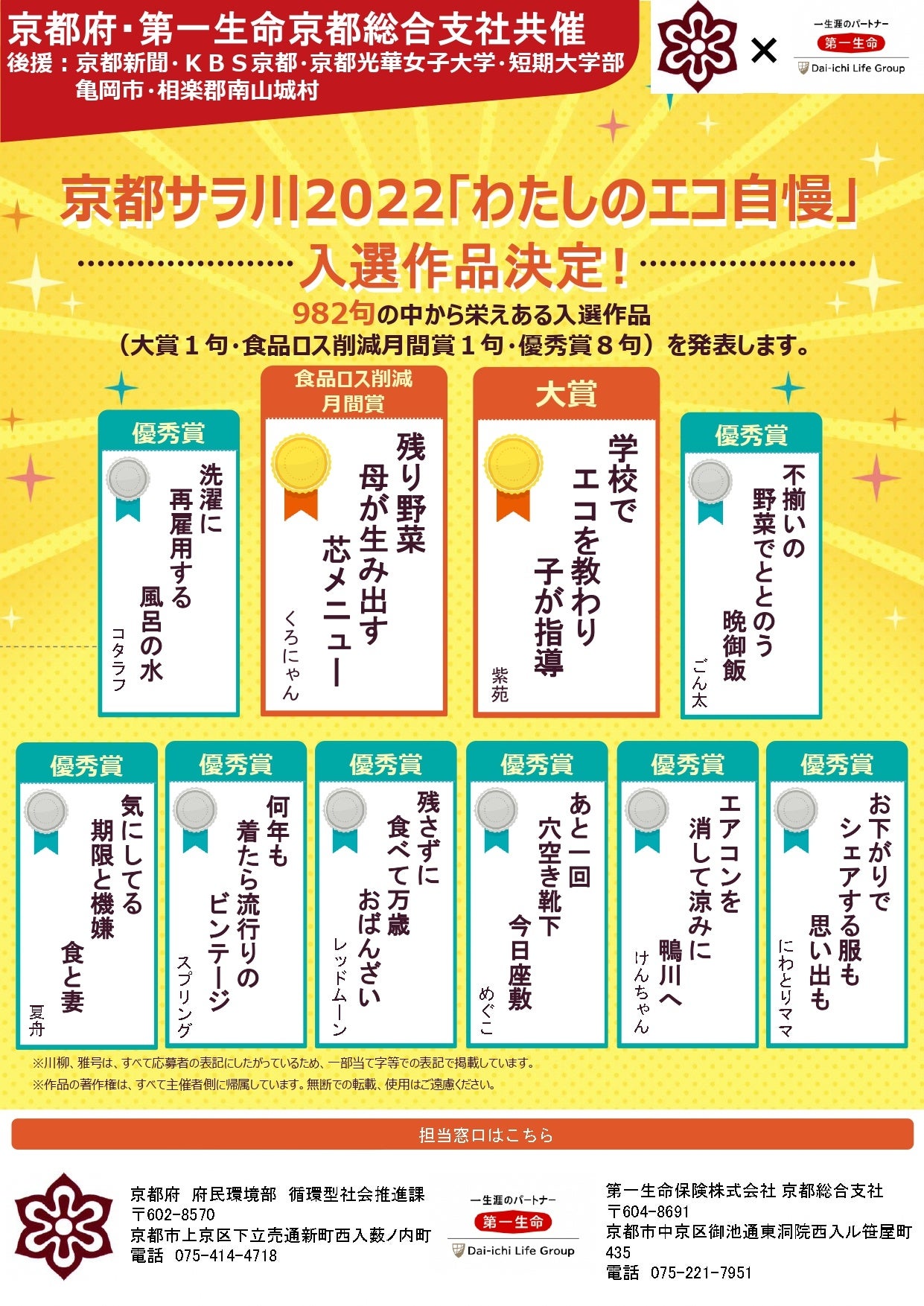 京都府と第一生命京都総合支社は、『わたしのエコ自慢』をテーマにエコに関する川柳を募集し、この度、大賞、食品ロス削減月間賞含め、エコ川柳10句が選ばれました。入選作品は、全国発表予定の“2022年サラ川全国優秀100句”と一緒にPRされ、“2022年サラ川全国優秀100句”の選考対象になります。