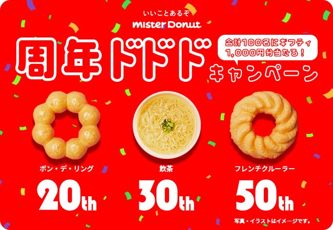 をフォローの上、キャンペーン期間中に「#周年ドドド」と、各商品のハッシュタグ「#ポン・デ・リング」「#フレンチクルーラー」「#飲茶」のいずれかを付けて、各商品の思い出を投稿ください。投稿くださった方から選考で30名様には、キャンペーン終了後に投稿文を、キャンペーンサイト、店頭販促物、および各種SNS(Twitter/Instagram/メルマガ)に掲載&ギフティ1,000円分をプレゼントいたします。さらに抽選で70名様には、ギフティ1,000円分をプレゼントいたします。