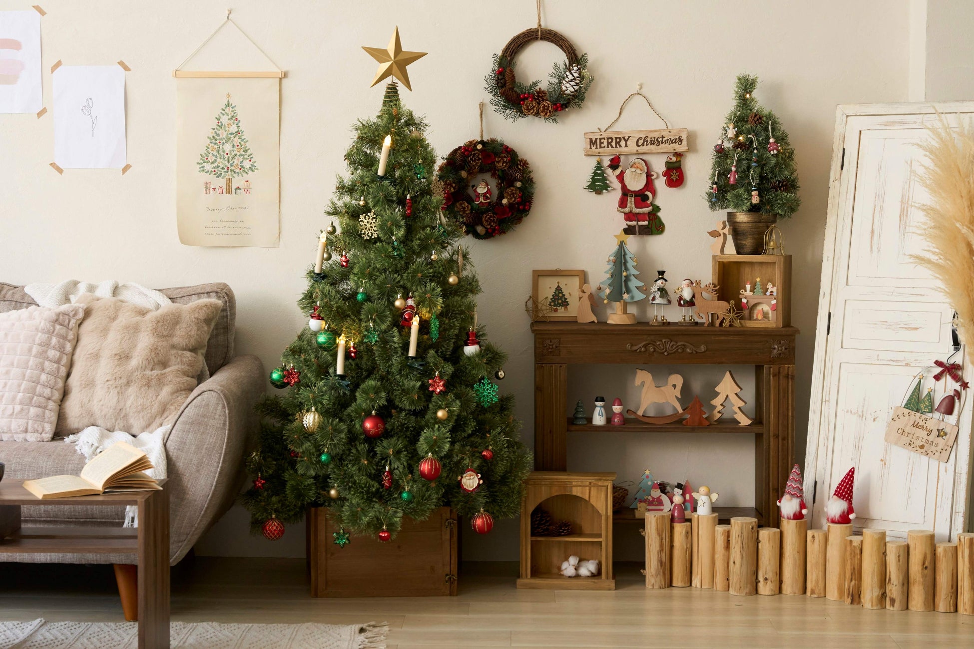 ベージュ・ホワイト・アイボリーなど淡い色をベースにクリスマスカラーの赤を差し色に入れました。