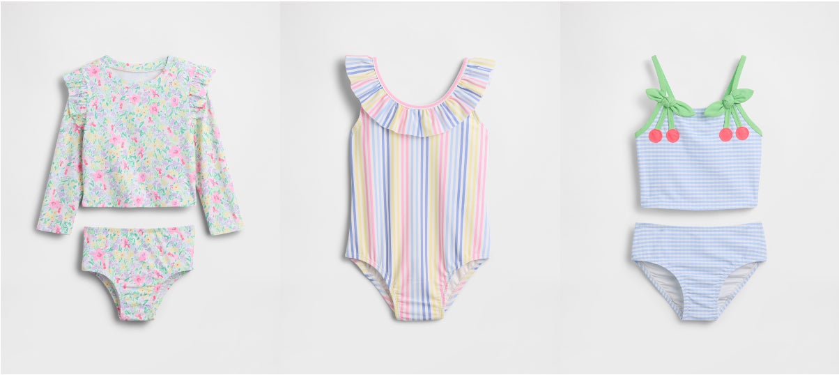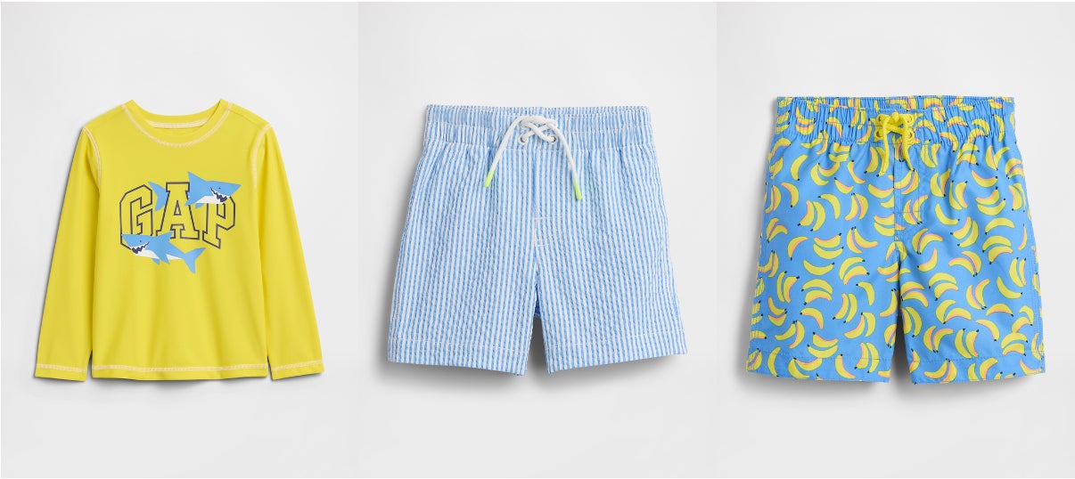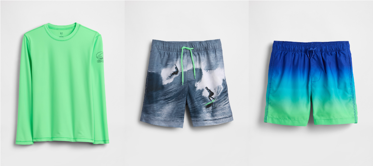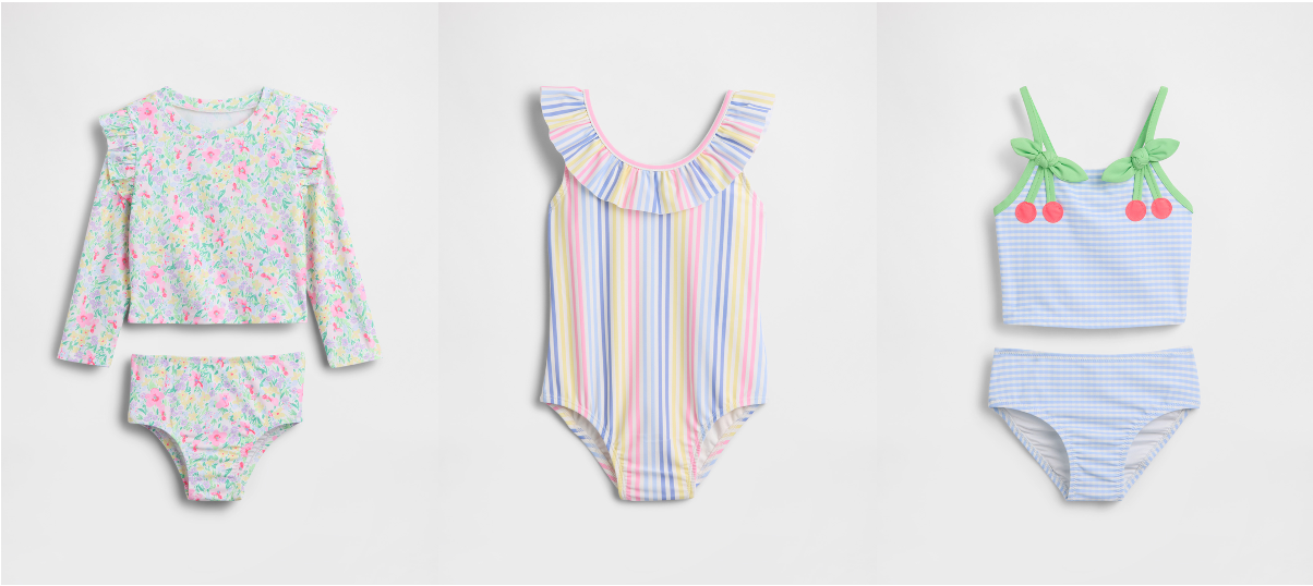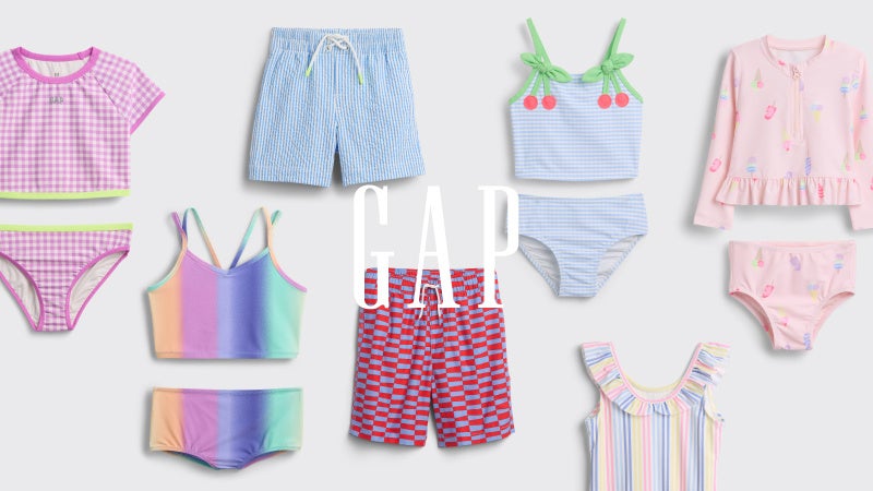 UVカット機能やセパレート、ラッシュガードなど、Gapらしい遊び心あるデザインがバリエーション豊かにラインナップ