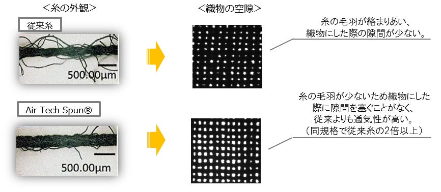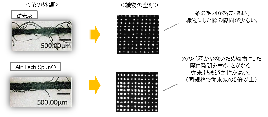 ■「Air Tech Spun®」は毛羽の少ない糸で従来の2倍以上の通気性を実現