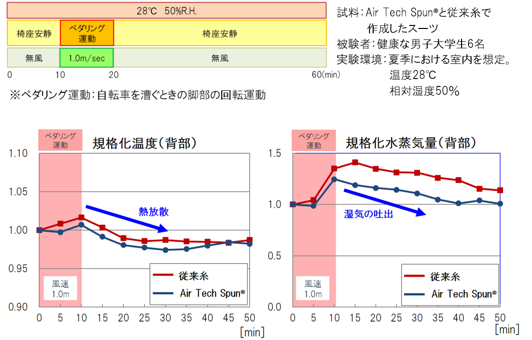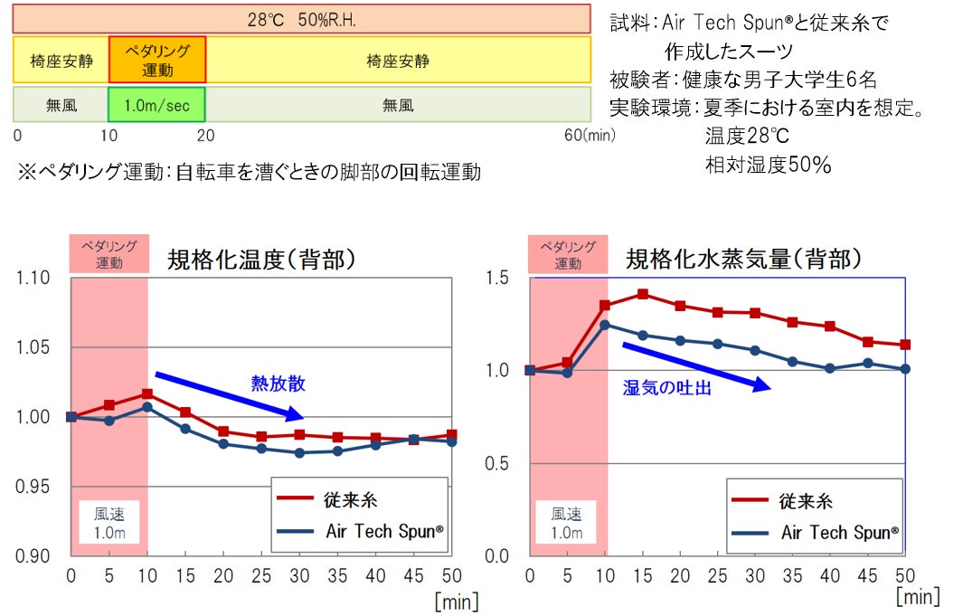 「Air Tech Spun®」を使用したスーツと、従来糸で作成したスーツを6名の被験者にそれぞれ着用していただき、同じ環境下でペダリング動作を実施。その後の衣服内温度及び湿度を測定した結果、「Air Tech Spun®」を使用したスーツの方が、熱放散性が高く、衣服内温湿度の上昇が少ないことが分かりました。