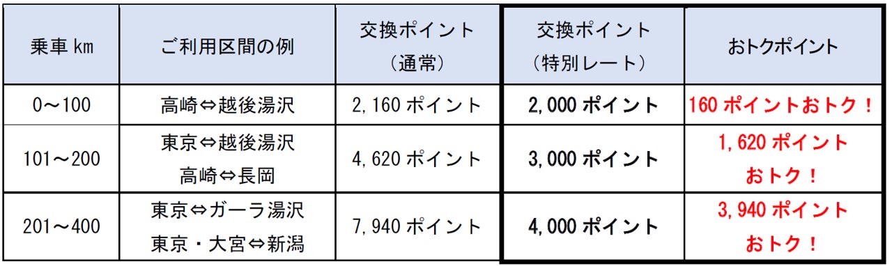 〇JR東日本は、JRE POINTを新幹線eチケットに交換できる「新幹線eチケット(JRE POINT特典)」の交換ポイント数を、上越新幹線「とき」・「たにがわ」限定で特別割引したおトクな商品を発売します。 〇「自然」「文化」「食」など、地域によってさまざまな楽しみ方ができる魅力溢れる春の新潟エリアを、ぜひこの機会に上越新幹線に乗って、おトクにお楽しみください。 |