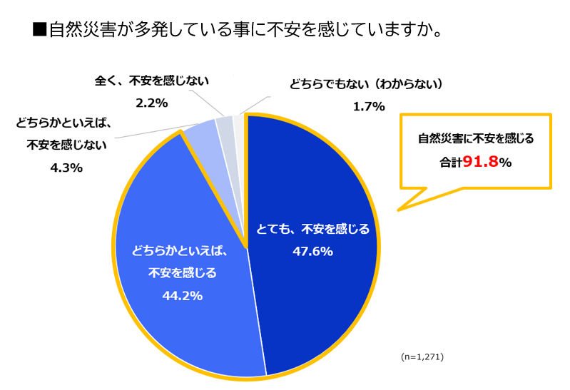 ここ数年、地震や大雨、洪水などの「自然災害が多発している事に、不安を感じていますか?」という問いについて「とても、不安を感じる」(47.6%)「どちらかといえば、不安を感じる」(44.2%)と、不安を感じている人は91.8%にのぼることが分かりました。