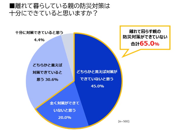 一方、「離れて暮らしている親の自宅について、防災対策は十分にできていると思いますか?」という質問では、「どちらかというと対策ができていないと思う」(45.0%)、「全く対策ができていないと思う」(20.0%)と、65.0%の人が対策が十分でないと感じていることが分かりました。