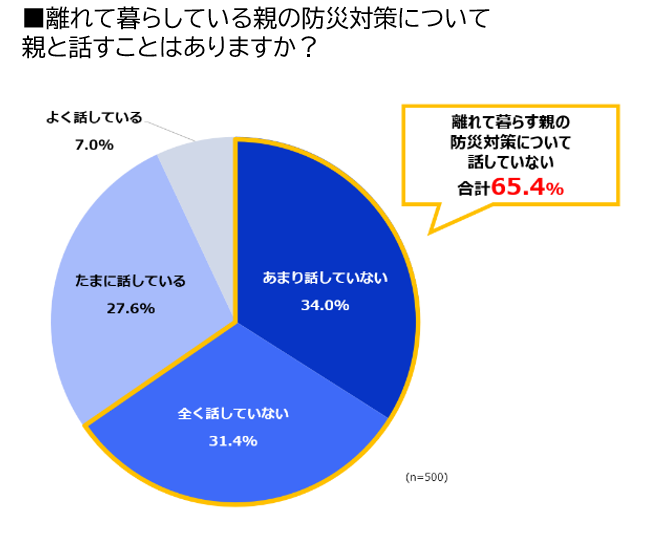 また、「離れて暮らしている親の自宅の防災について、親と話すことはありますか?」との問いには、「あまり話していない」(34.0%)、「全く話していない」(31.4%)と65.4%が防災について話していないという回答になりました。