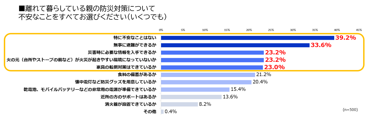 ■離れて暮らす親の防災対策について、「特に不安なことはない」が39.2%で1位。次いで「無事に避難ができるか」が33.6%、「災害時に必要な情報が入手できるか」と「火災が起きやすい環境になっていないか」は同率で23.2%、「家具の転倒対策はできているか」は23.0%。
