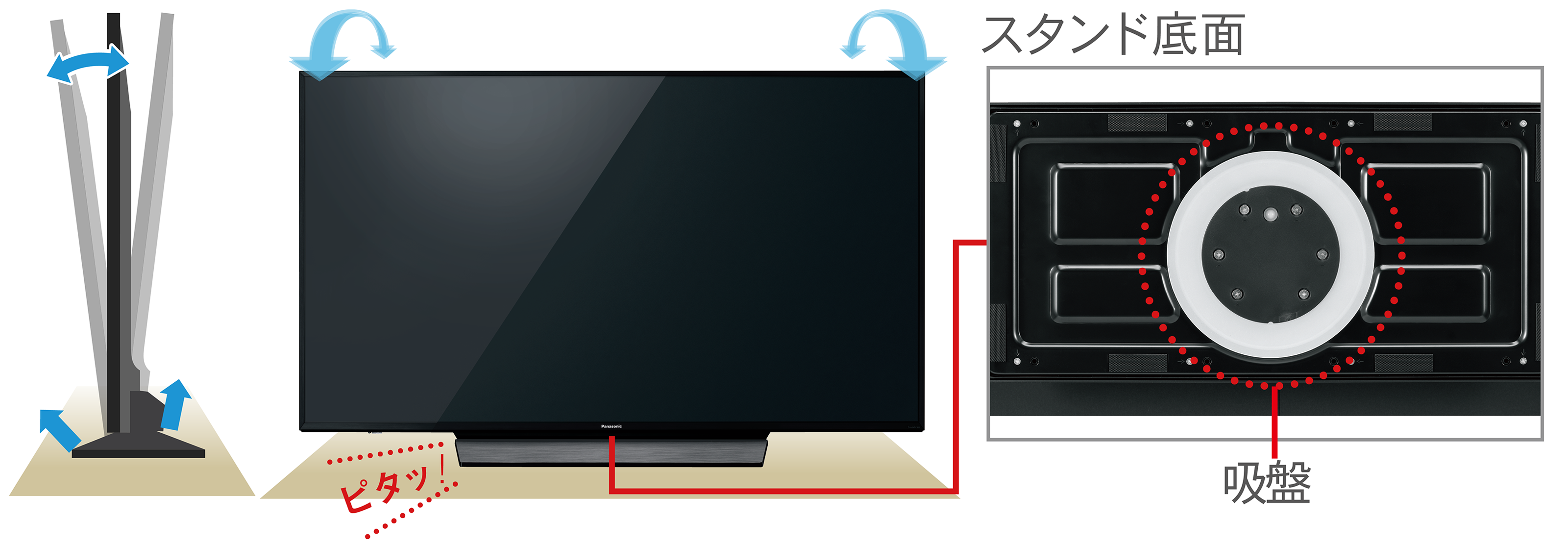 テレビ台にピタッと吸着する独自構造の「転倒防止スタンド」