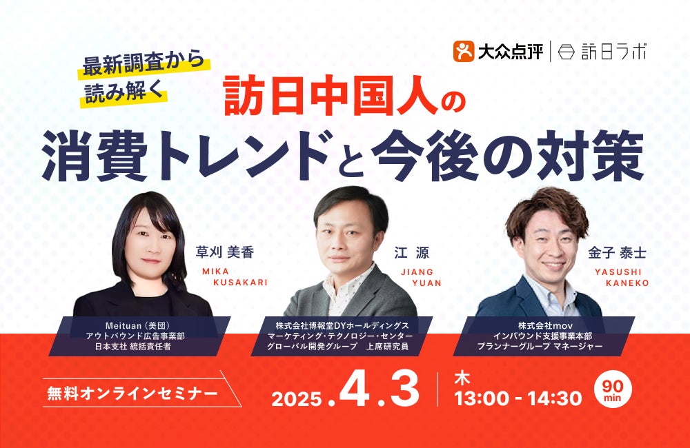 業界最大級のインバウンドビジネスメディア「訪日ラボ」及び 店舗向け集客一元化プラットフォーム「口コミコム」を運営する株式会社mov(代表取締役:渡邊 誠、本社:東京都渋谷区、以下mov)は、4月3日(木)13:00-14:30よりオンラインセミナーを開始します。参加費は無料です。