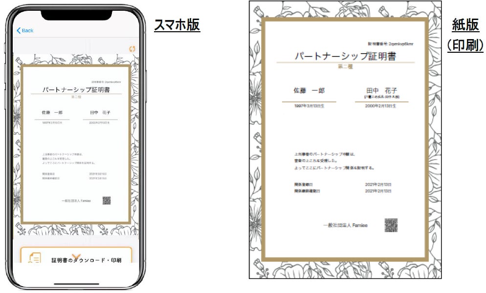 (*1)Famieeが発行する、スマートフォンのアプリで取得・利用ができる同性向けパートナーシップ証明書