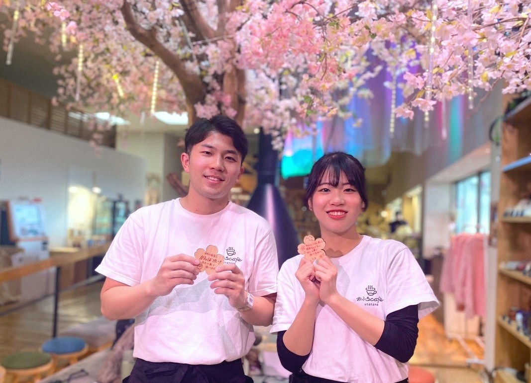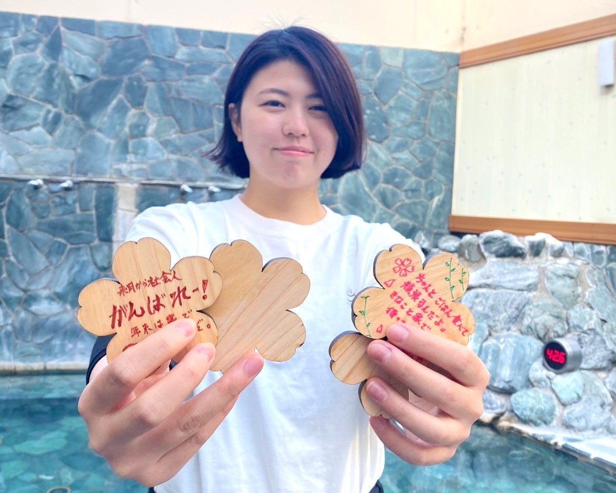 間伐材を利用した桜の形の入浴木にメッセージを添えて。埼玉県内のおふろcafe 等で「新生活応援風呂」を開催