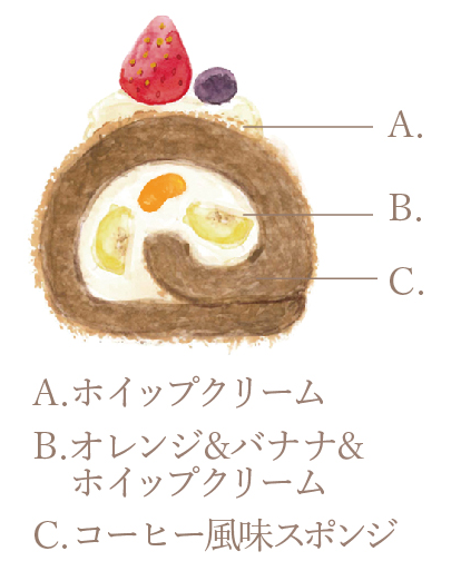 レンジ、バナナ、ホイップクリームをのせて巻いたロールケー