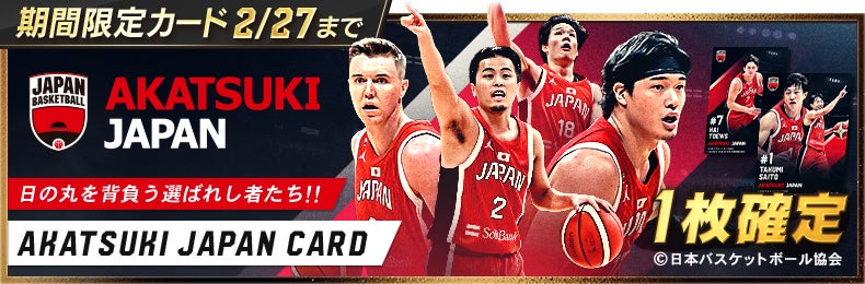 バスケットボール男子日本代表チームが新体制になり、重要な初戦が、いよいよ2月26日(木)より開催されます。 日本代表選手たちの雄姿をファンの皆様へ届けるべく、「B.LEAGUE CARD」にて新シリーズ「AKATSUKI JAPAN」をリリースいたします。本シリーズは、対象カードが1枚確定で獲得できる、限定販売の「10連カードパック」にて登場いたします。