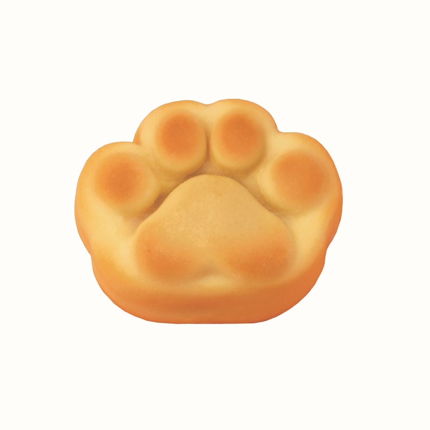 【内容】ねこの肉球をモチーフとした、思わずぷにぷにと触りたくなるほんのりミルク風味のふんわり生地に、ミルククリームが入ったパンです。パッケージは「mofusand」コラボデザインとなります。