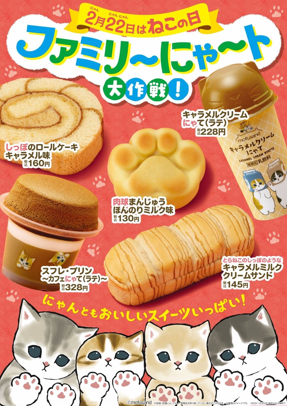 「スフレ・プリン~カフェにゃて(ラテ)~」「肉球まんじゅう ほんのりミルク味」「しっぽのロールケーキ キャラメル味」「とろけるチョコクッキー にゃて(ラテ)味」「とらねこのしっぽのようなキャラメルミルククリームサンド」「肉球みたいなパン(ミルククリーム)」「キャラメルクリームにゃて(ラテ)」「mofusand まんまる焼き」