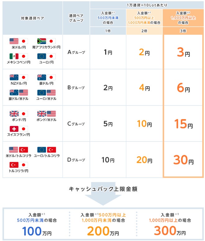 対象期間中の『外貨ネクストネオ』における指定通貨ペアの新規注文の取引量に応じて、最大100万円をキャッシュバックいたします。また、対象期間中の入金額※1に応じてキャッシュバック金額を増額するとともに、その上限金額を300万円にまで拡大いたします。