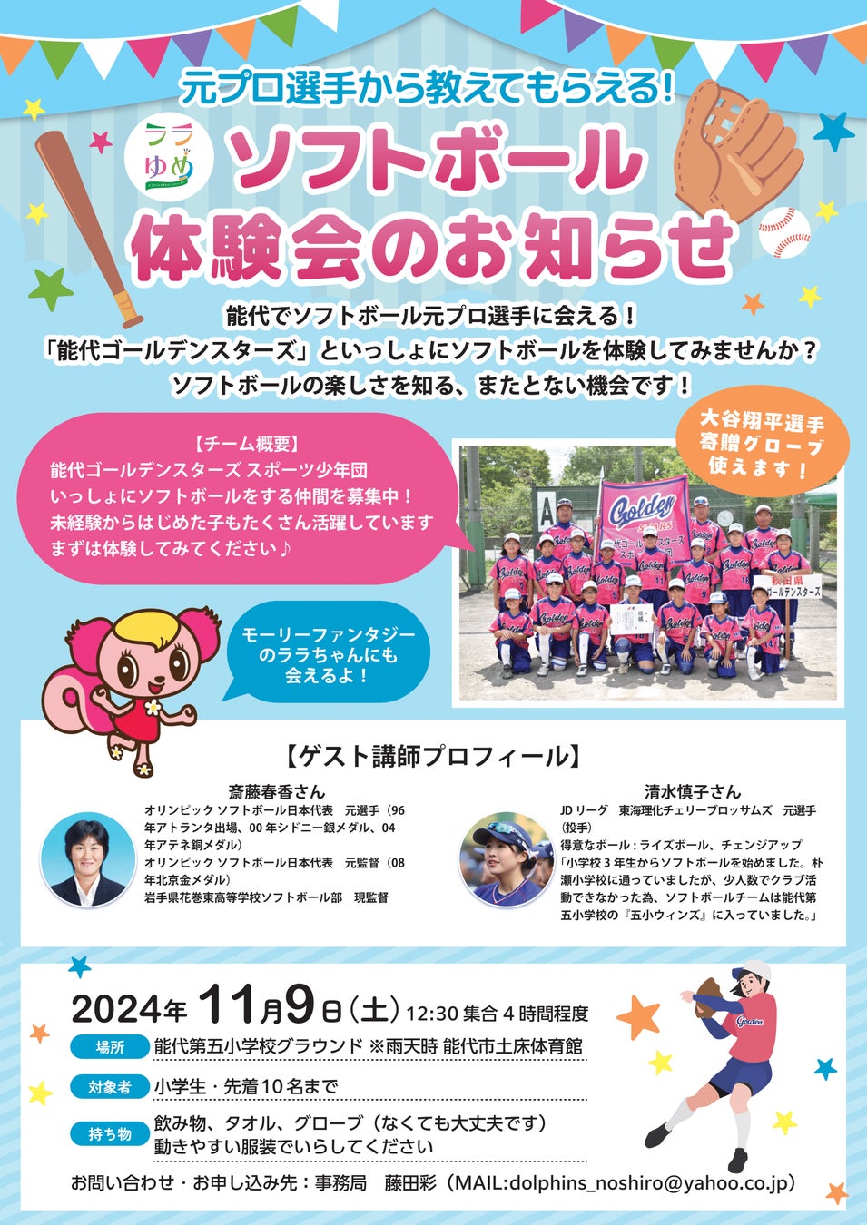 11月9日(土)元オリンピック日本代表監督・斎藤春香さんと元プロ選手・清水慎子さんを招き体験会を開催。秋田県能代市で存続危機にある市内唯一のソフトボール少年団を応援
