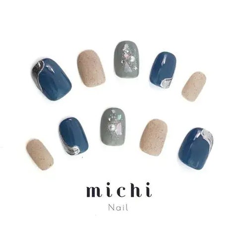 トーン違いのくすみブルーを組み合わせ、マットな砂ジェルで質感をプラス。シルバーミラーのニュアンスアートが洗練された指先を演出します。
